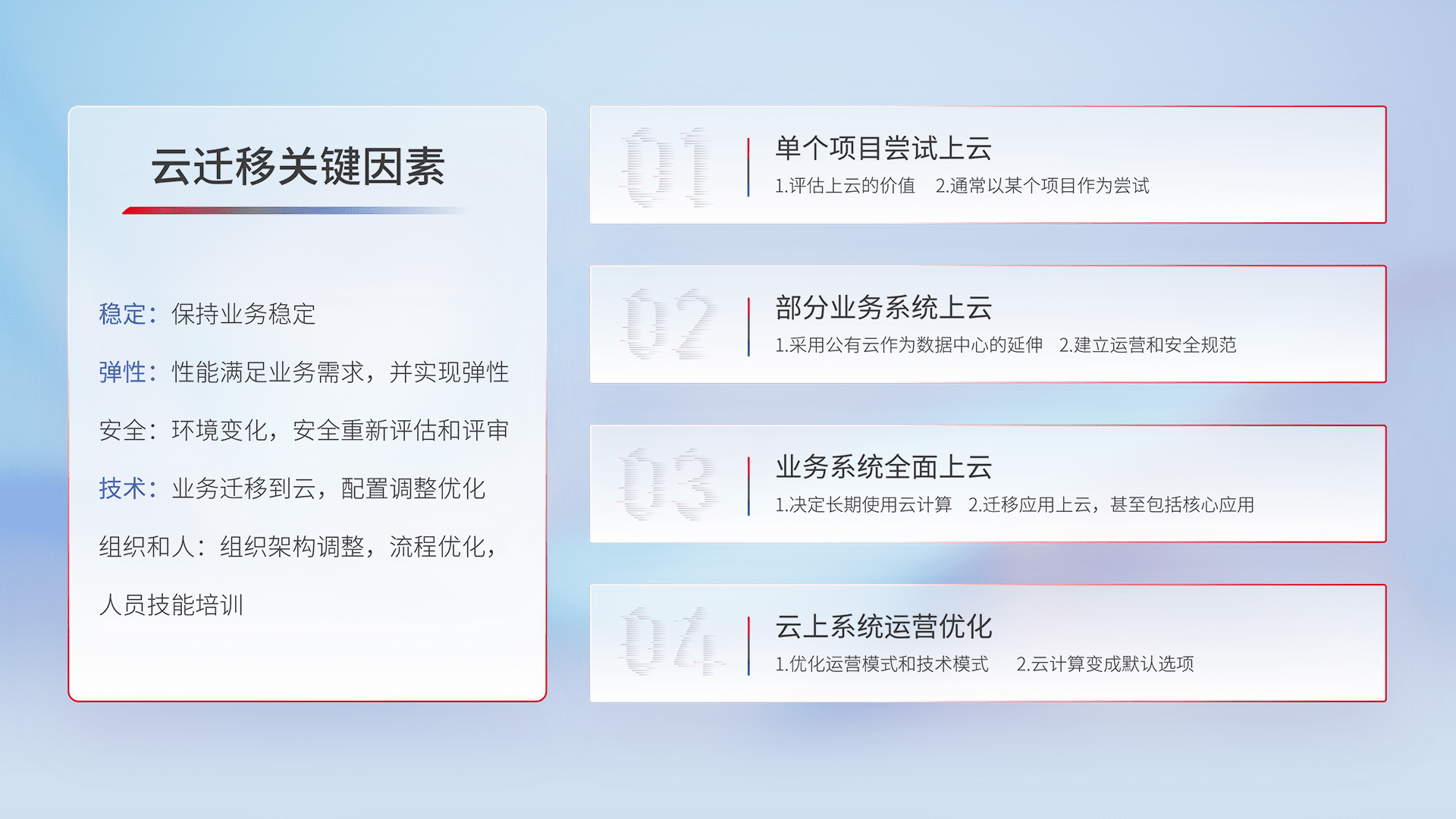 结合实际业务,,从规划设计、、、、云平台选型、、云原生改造、、、数据迁移、、、、集成交付,,,,迁移全过程为客户识别最佳上云路径,,,做好风险识别管理,,,设计网络架构、、、身份权限、、、安全审计合规、、、、操作审计、、、日志审计、、、监控告警策略、、、多站点容灾设计等,,,,对云上基础设施进行整体规划,,提升IT治理水平,,以满足弹性、、、高可用、、、高性能的需求。。